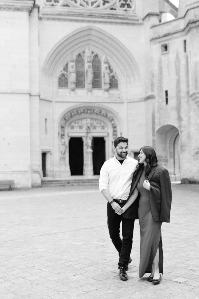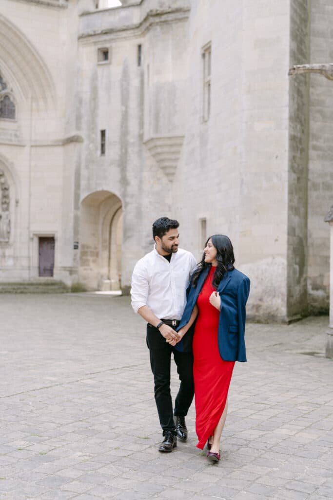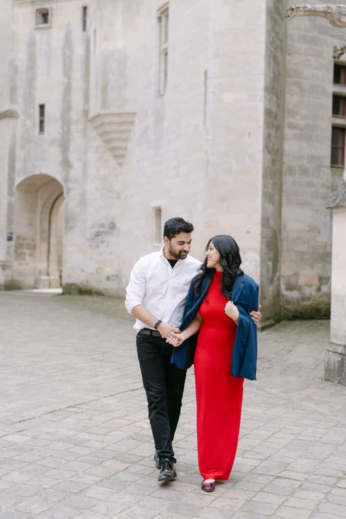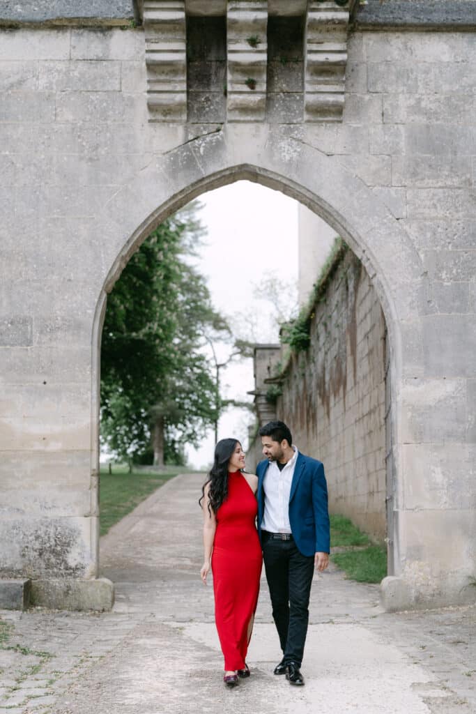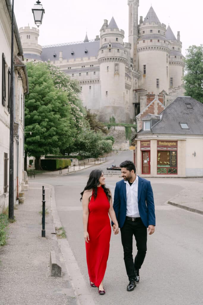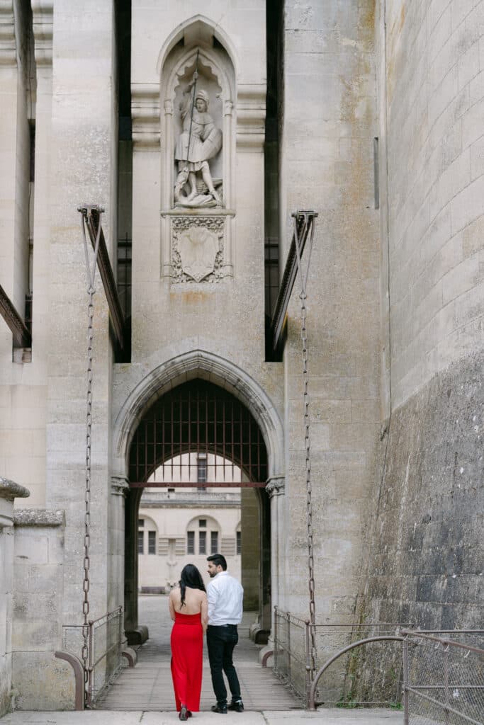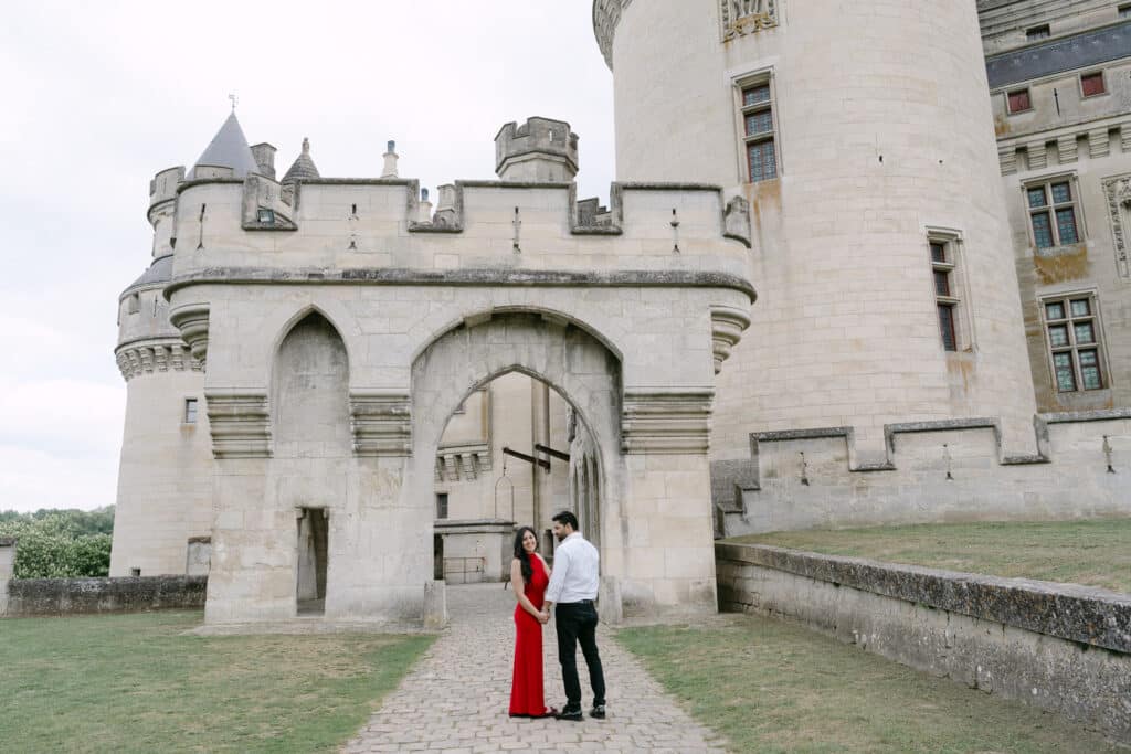 The Château de Pierrefonds is impressive from the very first step. Its tall towers, its stone walls, and its long paths create a unique atmosphere. As soon as the couple arrived, they slowed down. Because of this, the mood shifted right away. The place felt peaceful, even with its size. In addition, the soft morning light added a gentle tone to the scene.