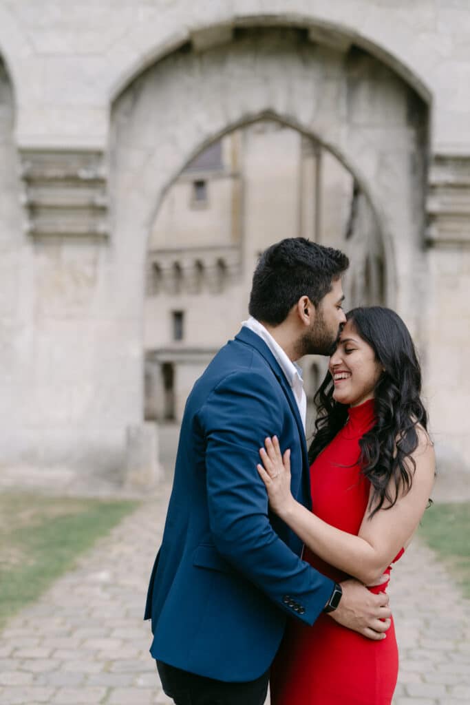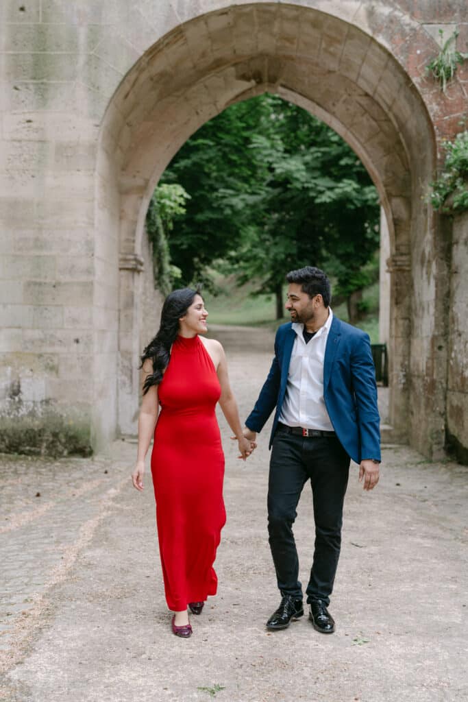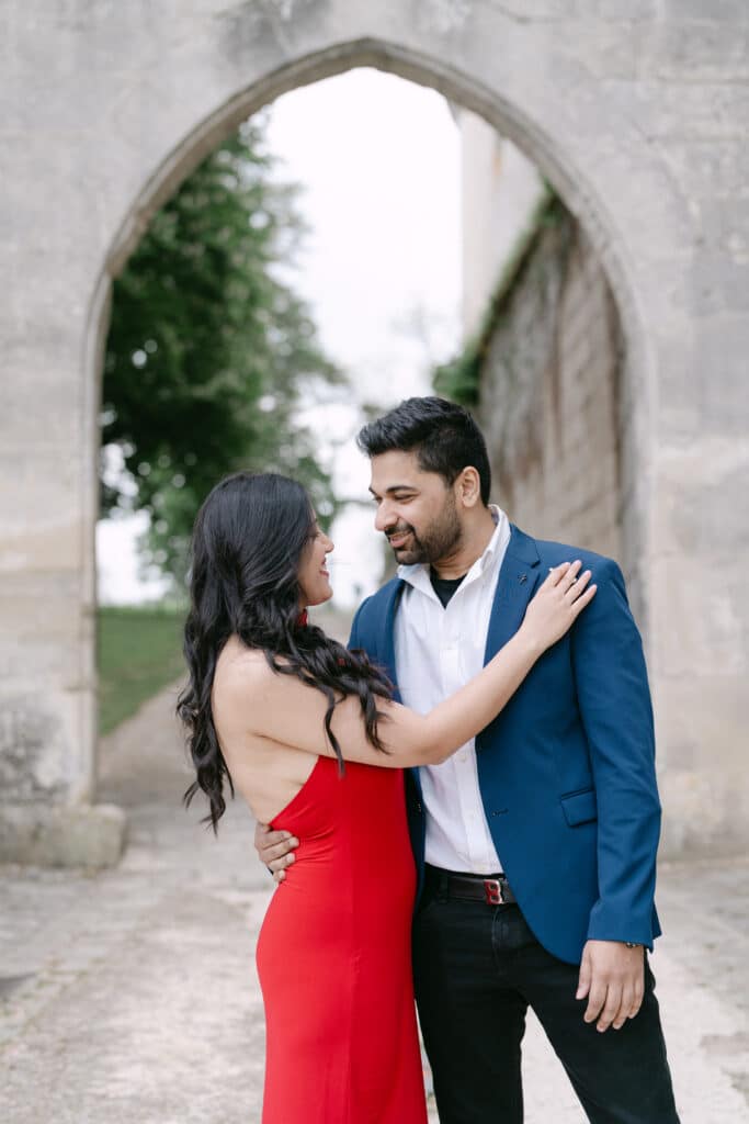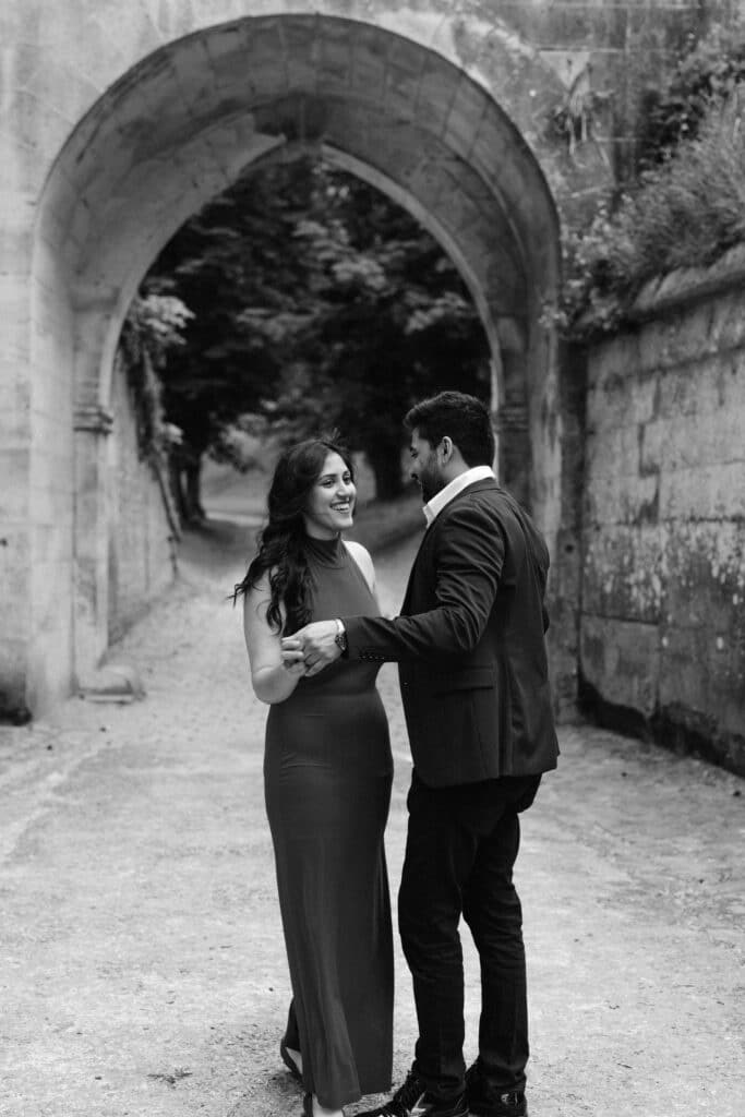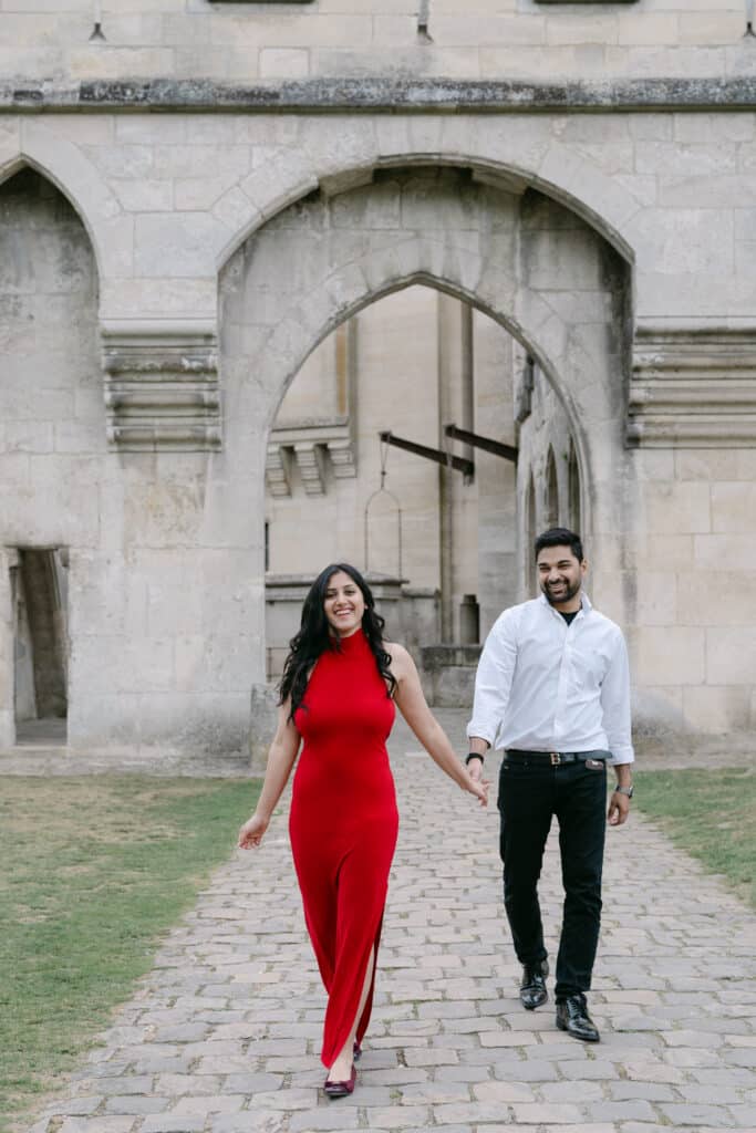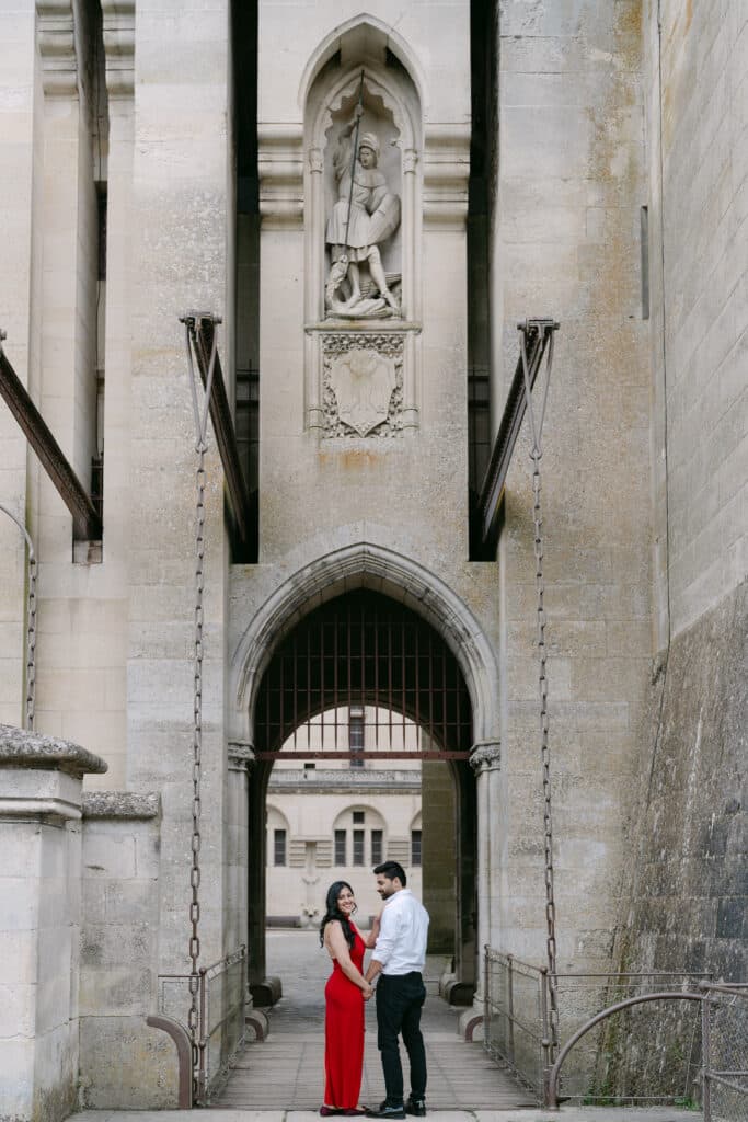 After the proposal, we walked through the grounds. The castle stayed in the background, adding depth to every photo. The couple relaxed even more. Because of this, the images felt natural and true. The long paths, the arches, and the stone textures all worked together. In addition, the soft light helped keep the mood warm and calm.