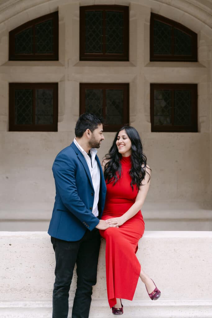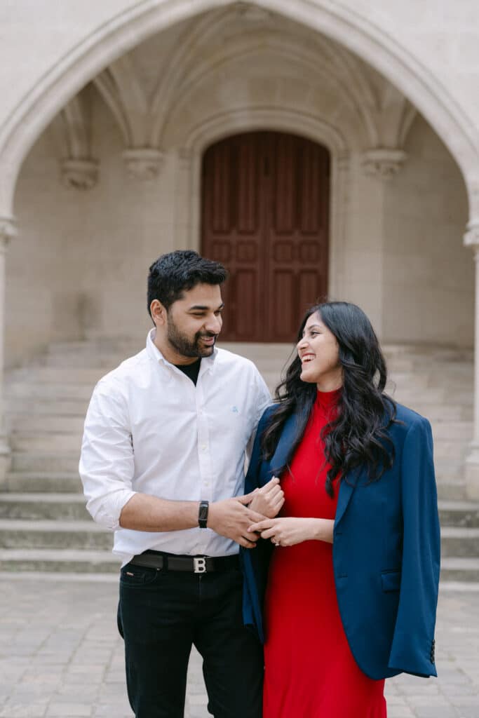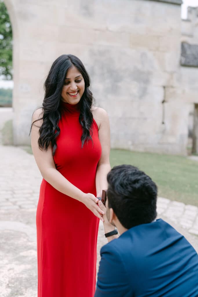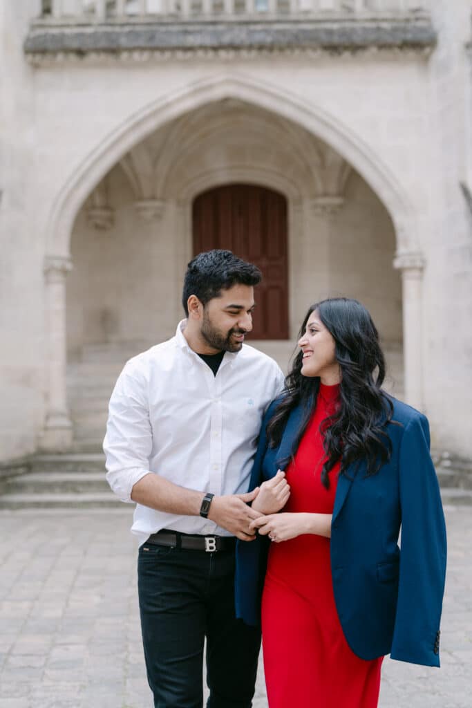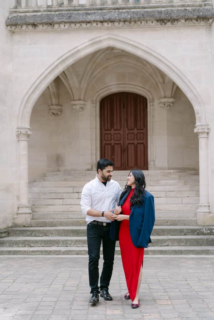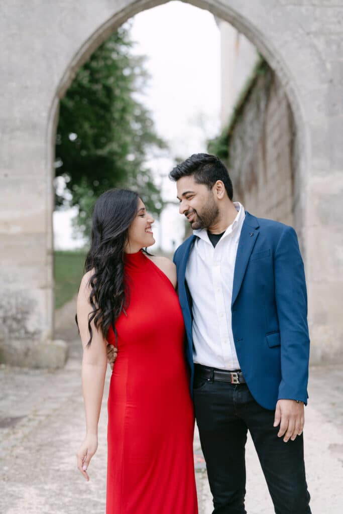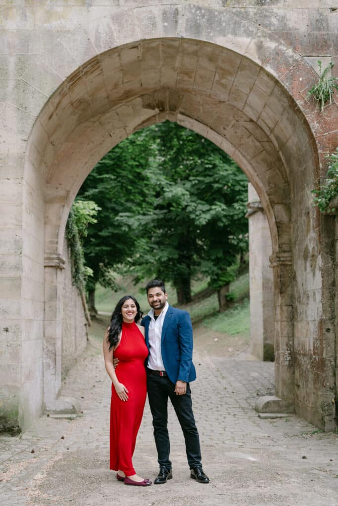 After the proposal, we walked through the grounds. The castle stayed in the background, adding depth to every photo. The couple relaxed even more. Because of this, the images felt natural and true. The long paths, the arches, and the stone textures all worked together. In addition, the soft light helped keep the mood warm and calm.